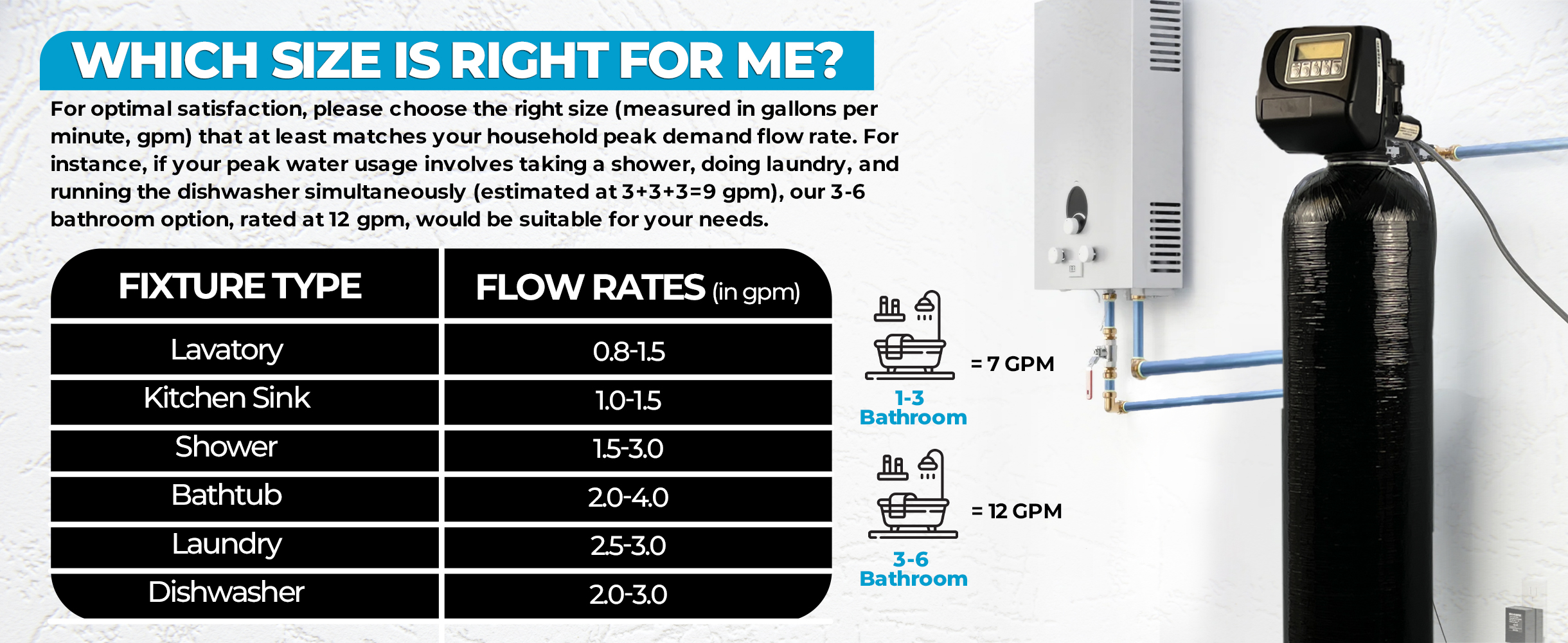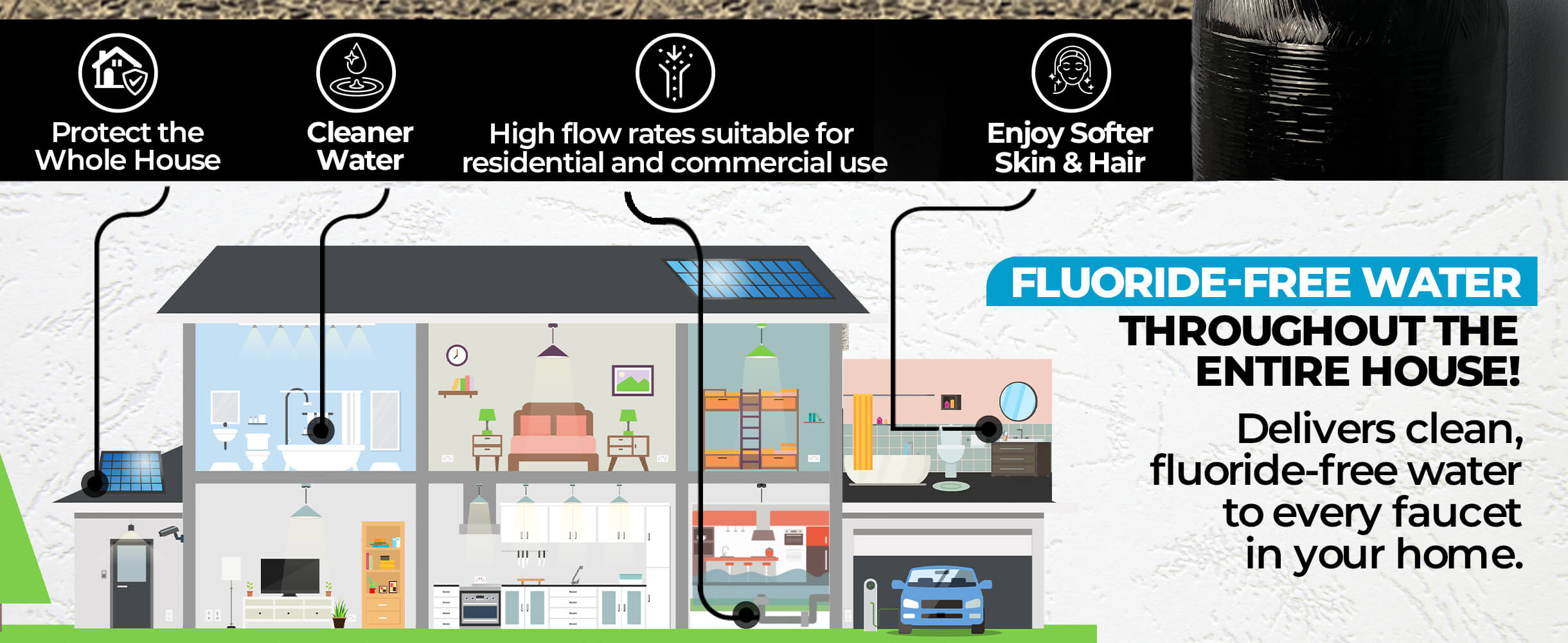 - Delivers filtered water to every faucet, shower, and outlet in your home or office.