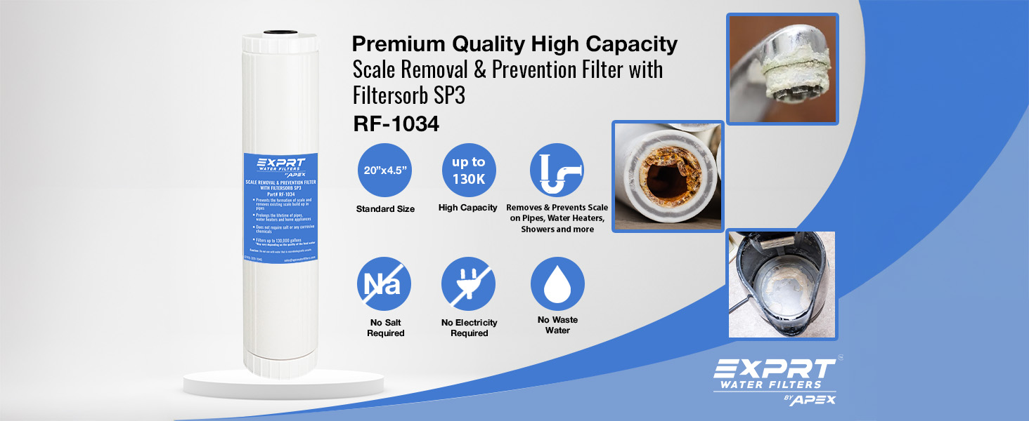 Protect your plumbing, faucet fixtures, water heaters and more from hard-water damage with theEXPRT RF -1034 Filtersorb SP3 scale-control cartridge, a salt-free whole-house water-conditioning filter engineered for limescale removal and long-term scale prevention. Using advanced Filtersorb SP3 Nucleation Assisted Crystallization (NAC) media, this point-of-entry filter transforms dissolved calcium and magnesium into harmless micro-crystals that won’t stick to pipes, faucets, or tankless water heaters—delivering scale-free, great-tasting water without adding sodium or altering TDS. The high-capacity cartridge fits any standard 4.5 × 20 in. “Big Blue” housing and sustains 12–15 GPM with virtually no pressure drop, making it ideal for large households on city or well water. Each cartridge of Filtersorb SP3 media can treat up to 130 000 gallons or 8-12 months* before replacement, slashing maintenance costs compared with traditional salt-based softeners. Enjoy salt-free descaling, corrosion protection, and extended appliance life in one eco-friendly cartridge—search “EXPRT RF-1034 Filtersorb SP3 Scale Removal & Prevention Filter 20 × 4.5 replacement” when it’s time to reorder.